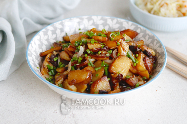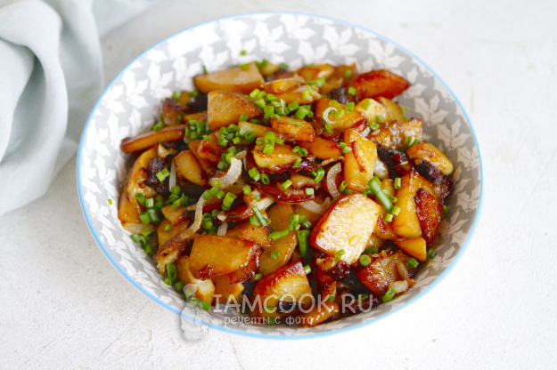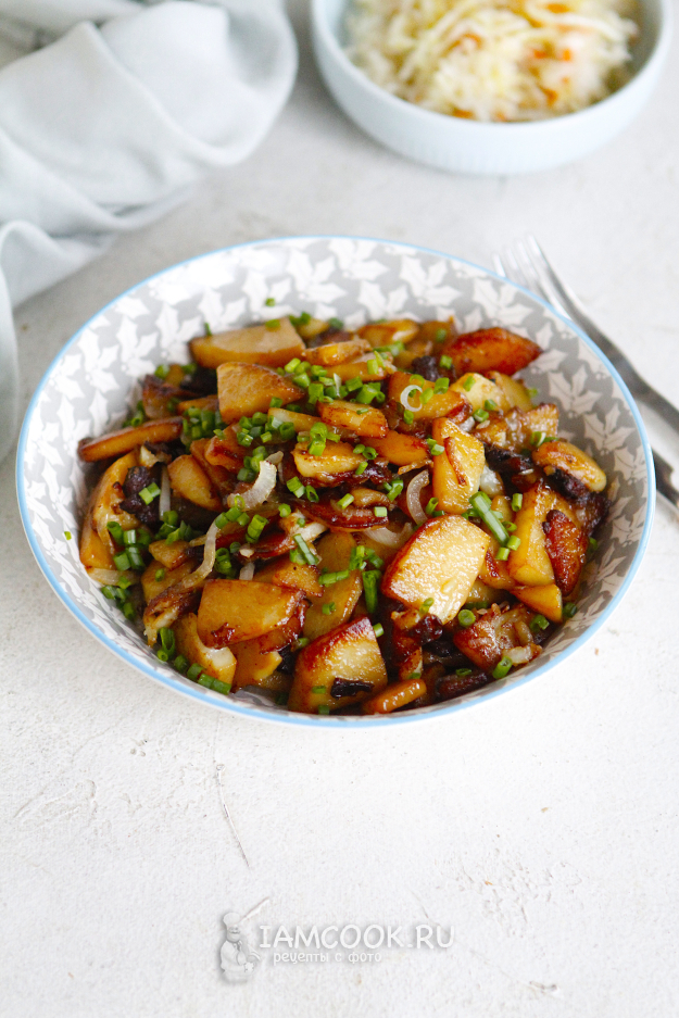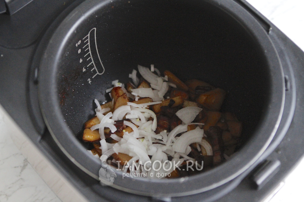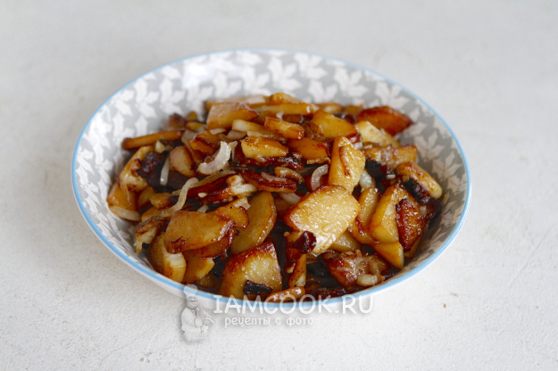 Добавьте репчатый лук, перемешайте и продолжите обжаривать картофель еще буквально 5 минут.