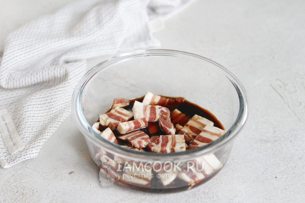 Сало с мясными прослойками нарежьте на крупные кусочки и переложите в чашу. Влейте соевый соус. Хорошо перемешайте и оставьте на столе на 10 минут.