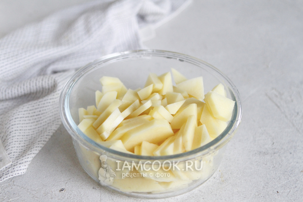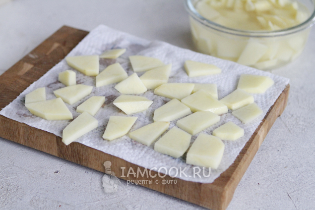 Для приготовления этого блюда важно правильно выбрать картофель - он должен быть специально для жарки. Почистите картофель и нарежьте его на средние кусочки.
