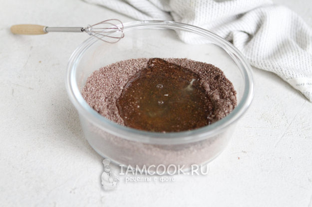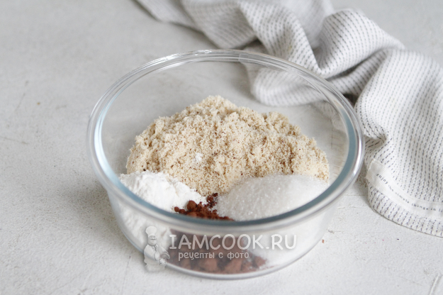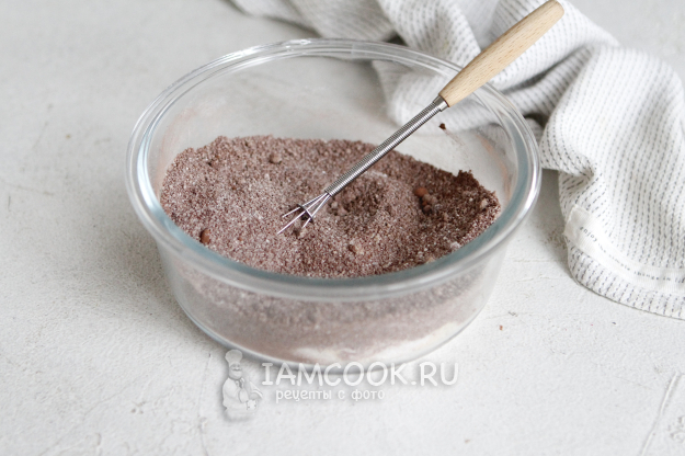 В чашу отправьте два вида муки, сахар и какао. Если пшеничную муку заменить на кокосовую, а сахар - на сахарозаменитель, то у вас получится настоящий Кето десерт.