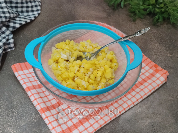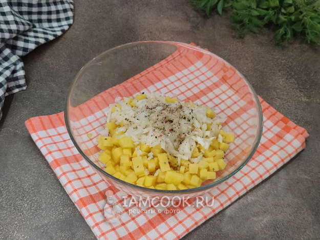Для начинки нарежем мелко лук и картошку. Картошку режем помельче, примерно как для салата "Оливье". Добавляем соль, перец, перемешиваем.