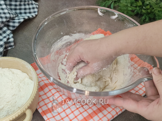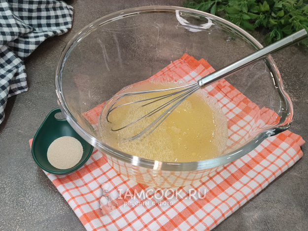 Всыпьте дрожжи и примерно половину муки, перемешайте. Замесите тесто, постепенно добавляя оставшуюся муку частями.