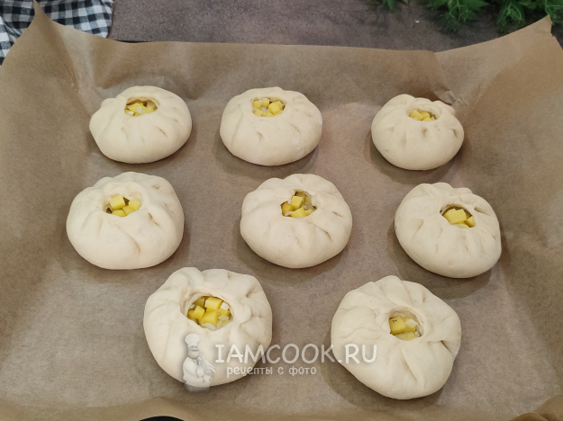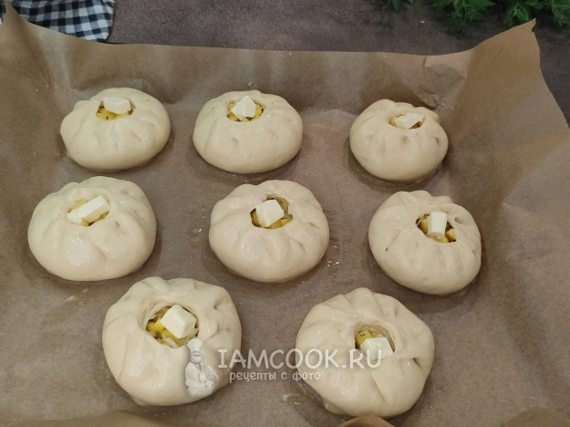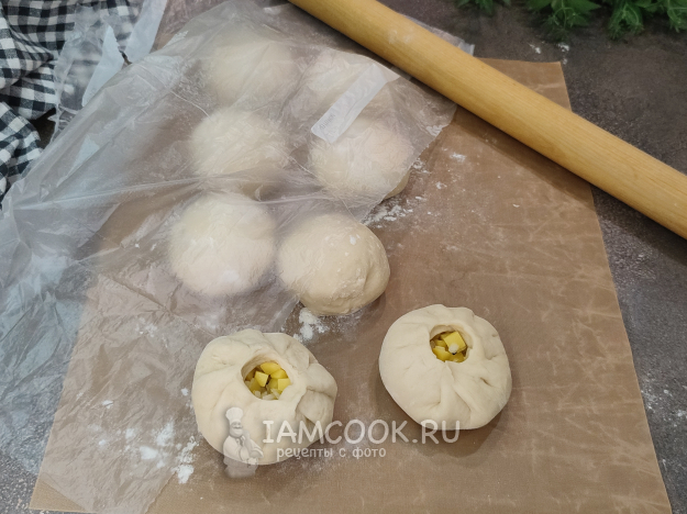 Каждую часть скатываем в колобочек, прикрываем пленкой/полотенцем и снова даем постоять минут 7-10. Затем раскатываем колобки в лепешку, края делаем тоньше, чтобы после защипывания теста везде было примерно одинаковое количество. Кладем начинку в серединку лепешки и собираем тесто складочками, оставляя небольшое отверстие в серединке для выхода пара.