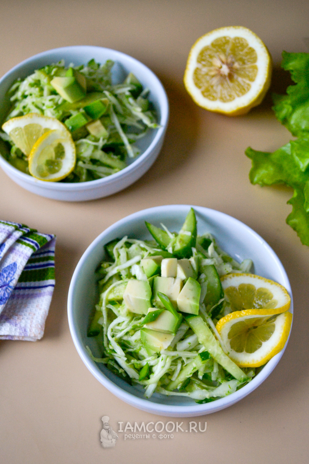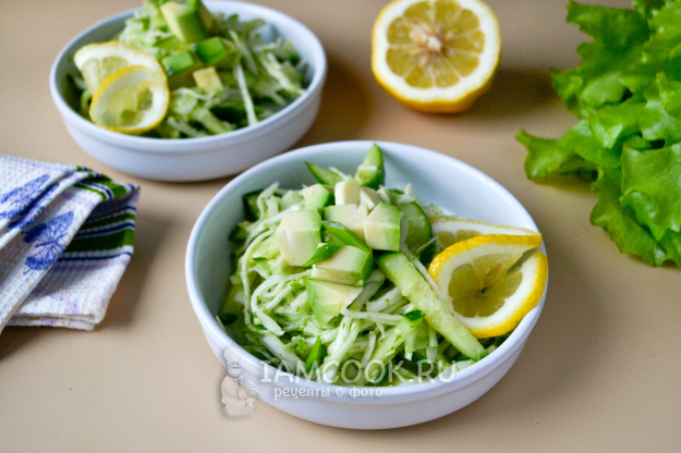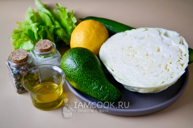 Соберите продукты для приготовления салата "Зеленая богиня". Капусту очистите от верхних жестких листьев, огурец, лимон и авокадо вымойте и обсушите. Листья салата вымойте и отряхните от воды.