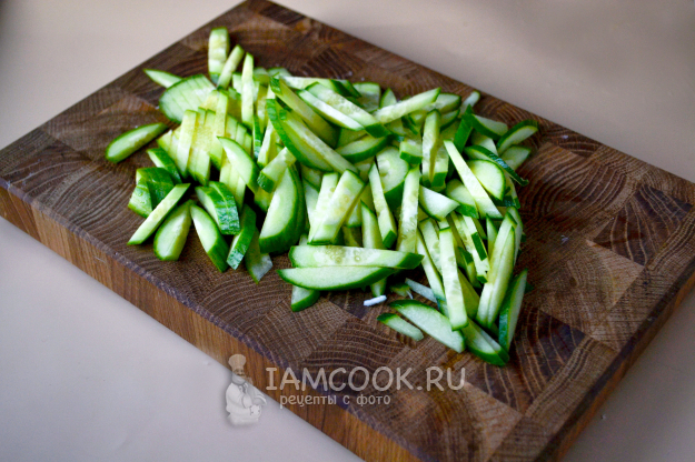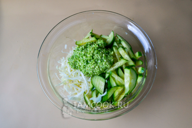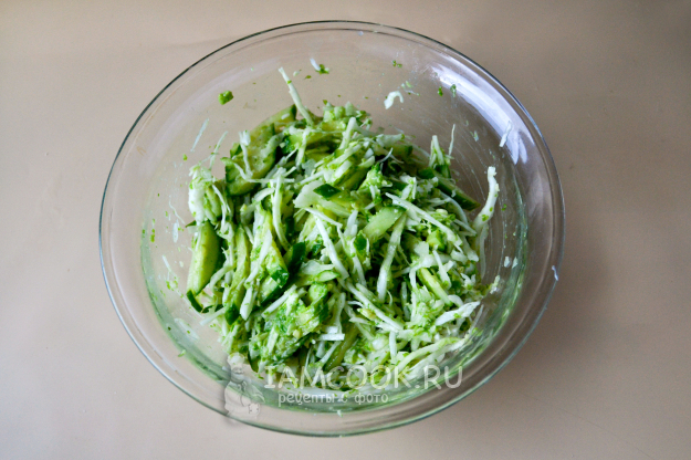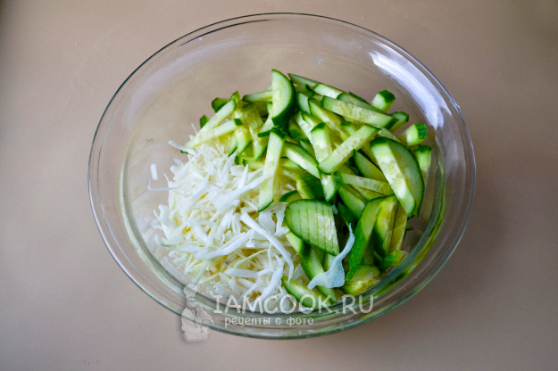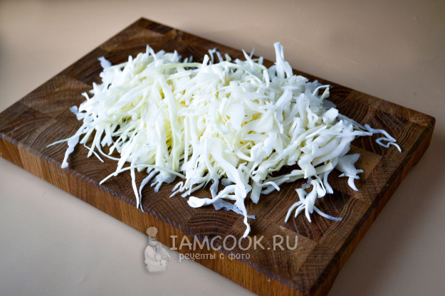 Капусту нарежьте тонкой соломкой. Чуть посолите и слегка помните руками, чтобы стала немного мягче.