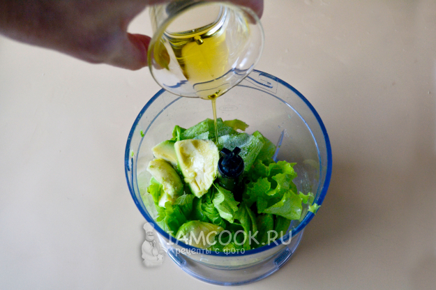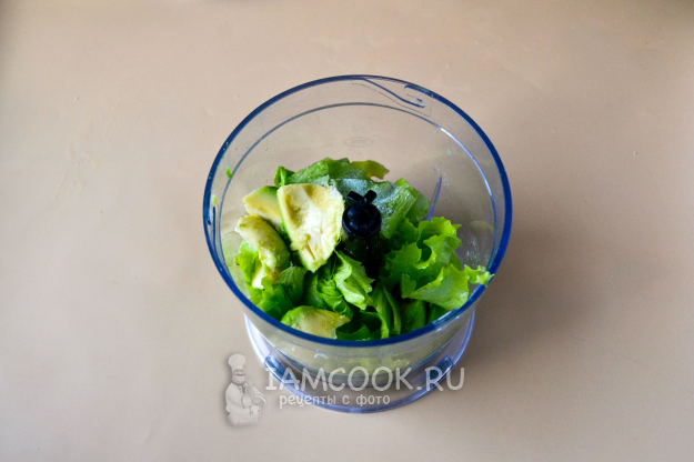 Авокадо разрежьте пополам, удалите косточку. Одну половинку используйте для подачи салата, а вторую - для заправки. Мякоть выньте при помощи ложки и положите в чашу измельчителя. Добавьте листовой салат и посолите.