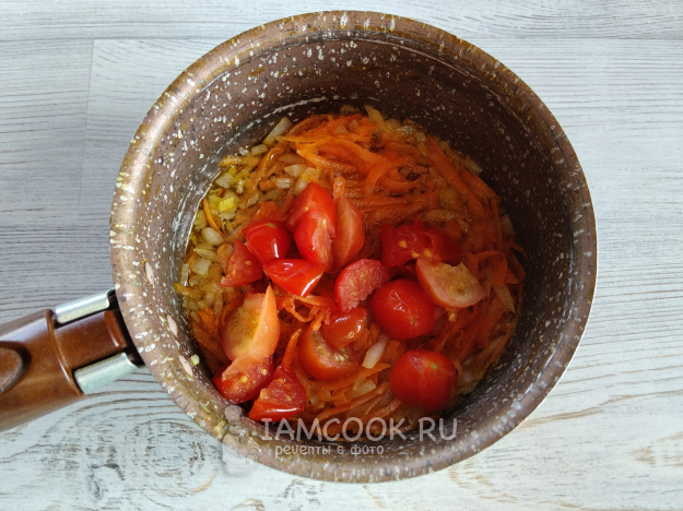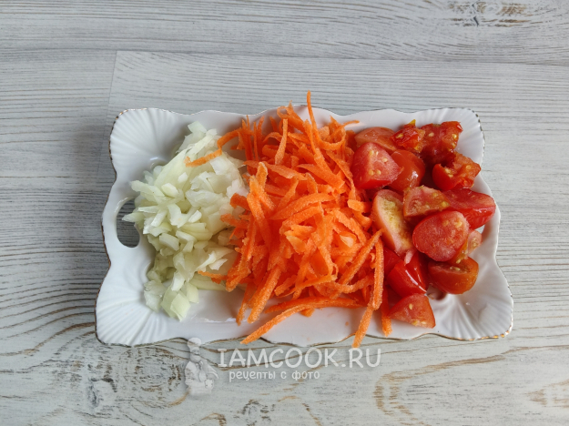Лук и помидор нарезать кубиком, морковь натереть на терке.
