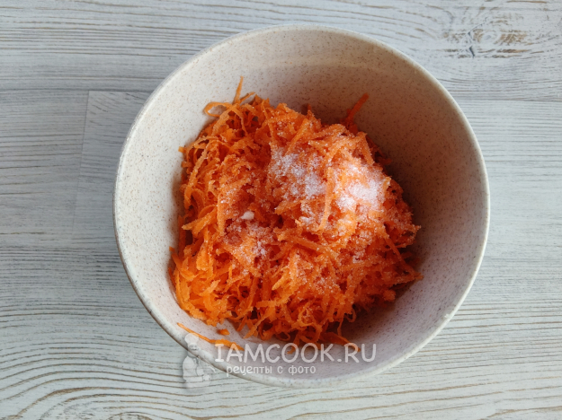 Очищенную морковь натереть на мелкой терке. Отжать.