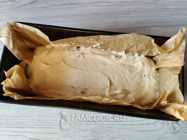 Форму для кекса застелить бумагой для выпечки, переложить тесто.