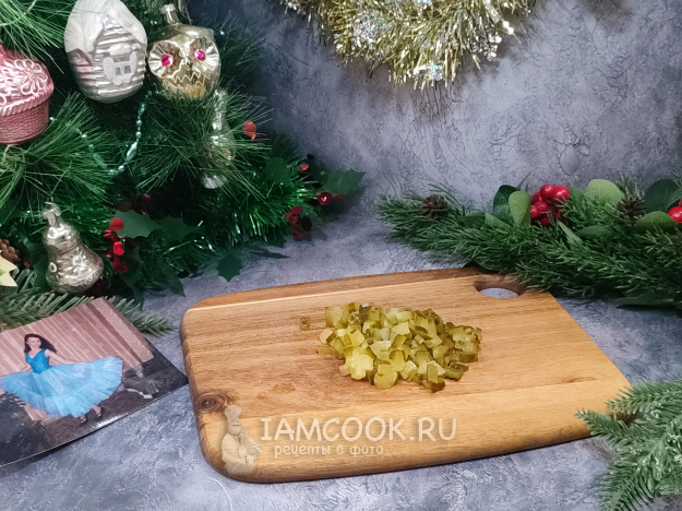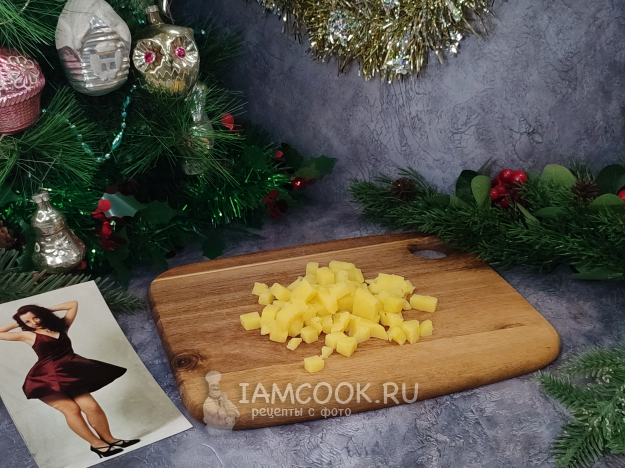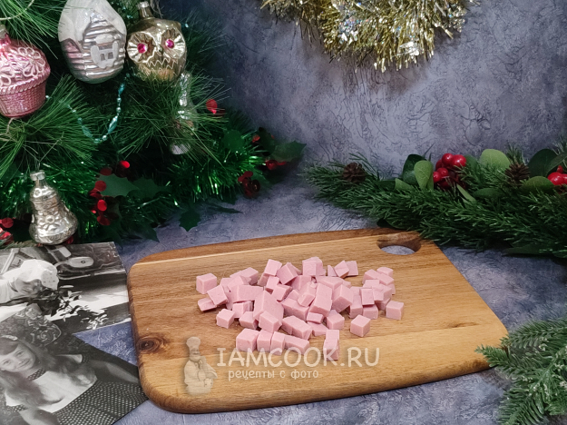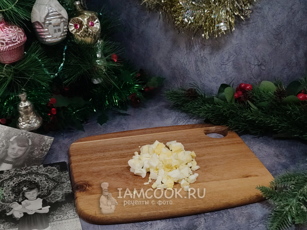 Все нарезаем мелким кубиком, по размеру сопоставимым с горошиной. Пока я была еще маленькой и нож мне не доверяли, обычно, пока мама и бабушка резали салаты, папа (любил фотографировать) устраивал мне фотосессию, почему-то непременно на фоне ковра на стене 😘, ну и у елки, конечно.