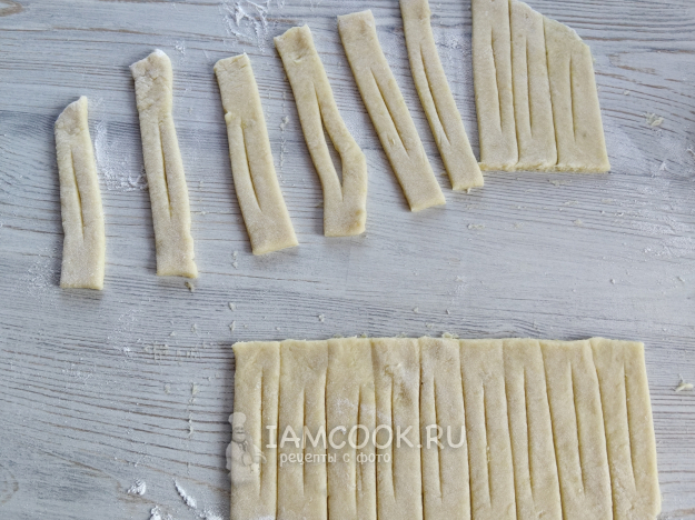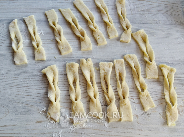 Один край теста протянуть через отверстие и вывернуть в ту же сторону, чтобы получились вот такие завитки.
