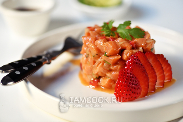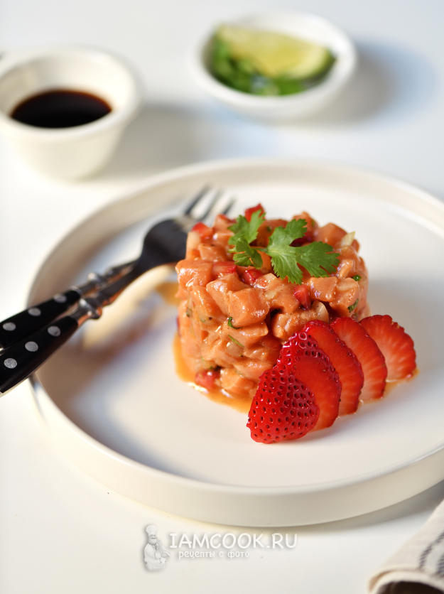 Тартар из лосося с клубникой готов! Налейте бокал холодного просеко и наслаждайтесь)