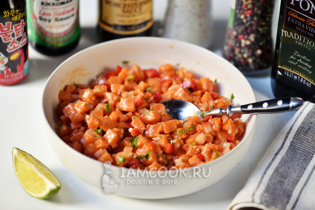 Заправляем оливковым маслом, перемешиваем, даем постоять минут 5-7 и пробуем. Уже на этом этапе будет понятно, чего не хватает, поскольку рыба пустит немного своего сока и разбавит маринад. Если не хватает вустерского соуса, остроты, кислоты или соли - смело добавляйте, и можно подавать.