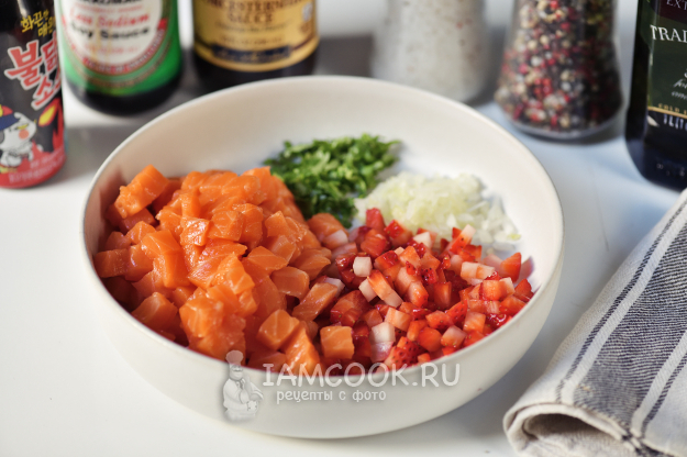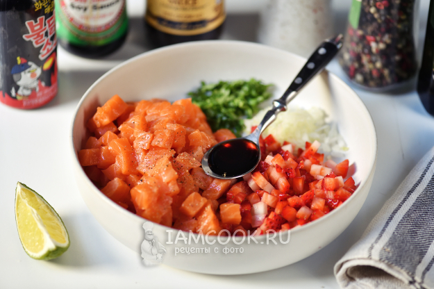 Срежьте клубничные хвостики, ягоды нарежьте мелким кубиком. Снимите филе лосося с кожи острым ножом, удалите косточки вдоль спинки, если есть. Нарежьте небольшим кубиком.