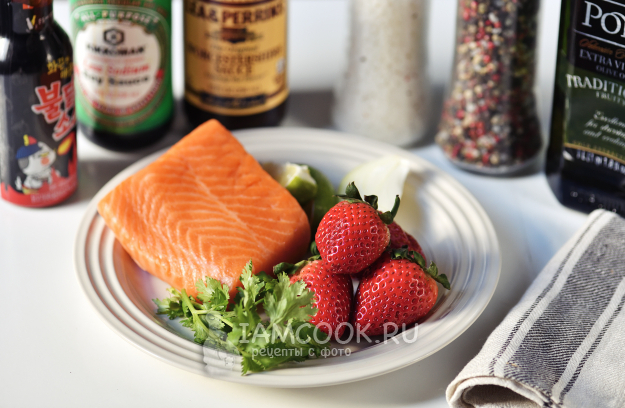 Соберите все необходимые ингредиенты для приготовления тартара из лосося с клубникой. Лук, кинзу и клубнику помойте под проточной водой, обсушите тщательно бумажным полотенцем. Если боитесь использовать сырого лосося, тогда отправьте его в морозилку на сутки, затем разморозьте и также хорошо промокните бумажным полотенцем.