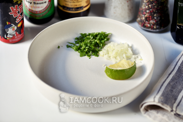 Луковицу нарежьте настолько мелко, насколько сможете, сбрызните ее соком лимона или лайма сразу же. Мелко нарубите кинзу, сложите все в глубокую миску.
