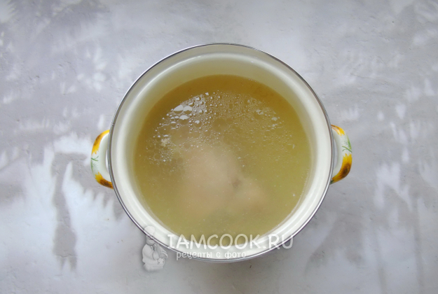 Сварите бульон. Подойдет любая мясистая часть курицы. Курицу помойте, выложите в кастрюлю и залейте водой. Когда содержимое кастрюли дойдет до кипения, огонь убавьте до минимума и снимите пену. После варите курицу до мягкости. Отварную курицу переложите на тарелку.