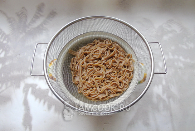 Тем временем гречневую лапшу поломайте на две части и выложите в кастрюлю с кипящей подсоленной водой. Варите 4-5 минут, до готовности. Соба варится очень быстро. Затем откиньте её на дуршлаг.
