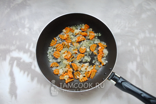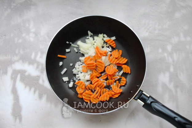Репчатый лук мелко нарежьте, морковь можно натереть на терке. Я её нарезала фигурным ножом. Выложите овощи в сковороду с растительным маслом.