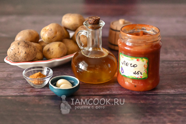 Соберите все продукты для приготовления картошки с лечо в духовке. Картошку лучше брать некрупную.