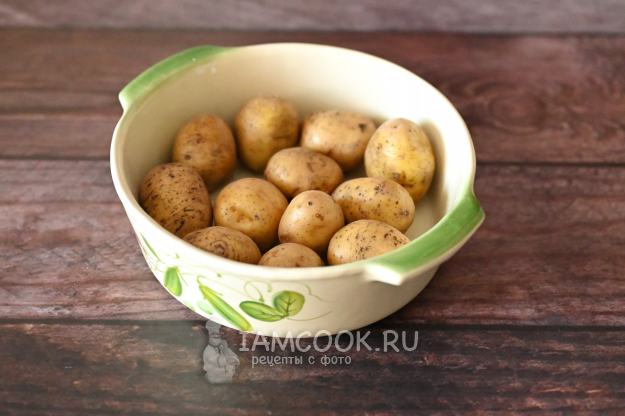 Тщательно вымойте клубни картофеля жёсткой щёткой, положите в форму для запекания и отправьте в разогретую до 200°С духовку. Запекайте до мягкости. По времени у меня ушло 45 минут, а вы смотрите сами. Всё зависит от духовки, сорта и размера картошки.