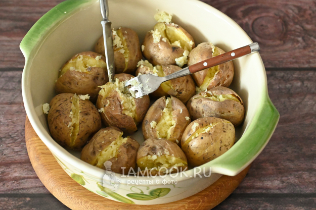 Картофель запёкся и стал мягким. Но прежде чем полить его лечо, сделайте на каждой картофелине надрез и слегка разрыхлите мякоть, чтобы она впитала в себя вкус и аромат заливки.