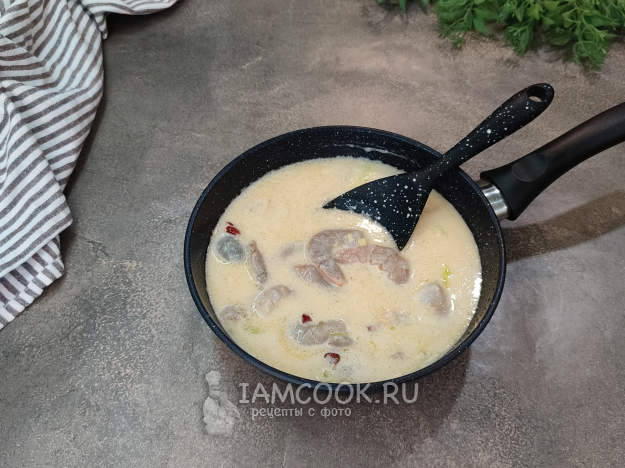 Выложите в соус креветки, варите буквально пару минут, креветки станут розовыми, немного сожмутся - они готовы).