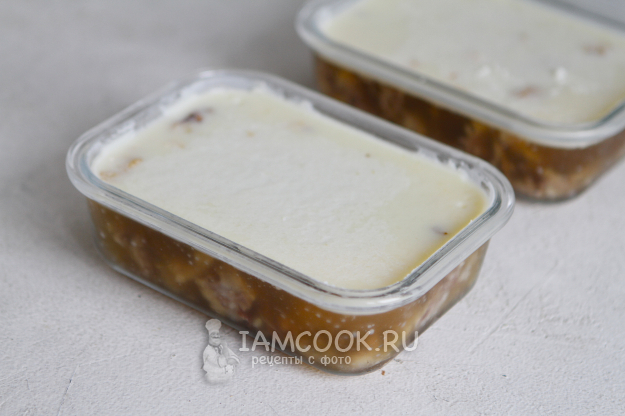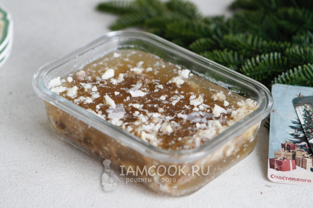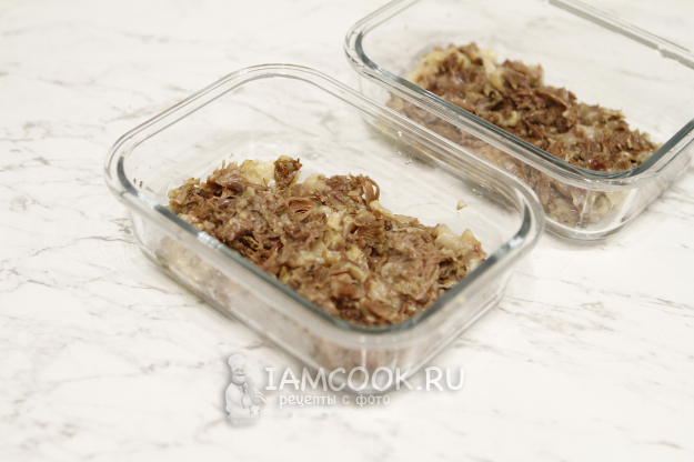 Разлейте бульон по формочкам. Если у форм есть крышки, то закройте их крышками, если нет, то накройте пленкой и отправьте холодец застывать в холодильник на 8-10 часов. Я отправила холодец в холодильник на ночь.