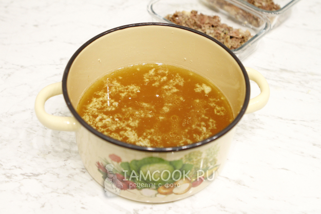 Бульон процедите. Пропустите через пресс чеснок и добавьте его в бульон. Попробуйте бульон на соль, при необходимости досолите.