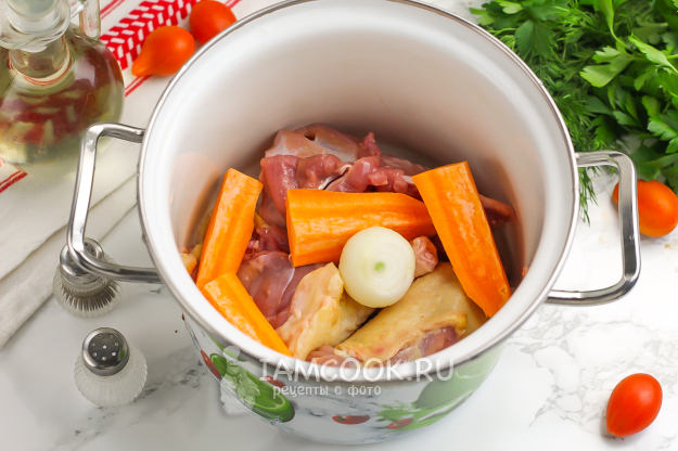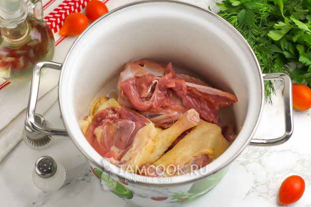 Разрежьте тушку птицы на части, отберите половину из них и промойте, выложите в кастрюлю либо казан.