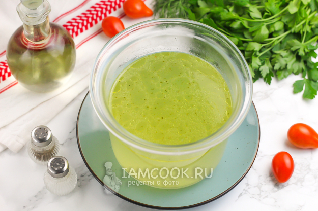 Перелейте бульон через ситечко в глубокую емкость. Всыпьте желатин и спрессуйте в него очищенные зубчики чеснока. Оставьте на 5 минут для набухания желатина и хорошенько перемешайте. Попробуйте на вкус и подкорректируйте при необходимости.