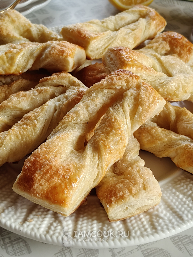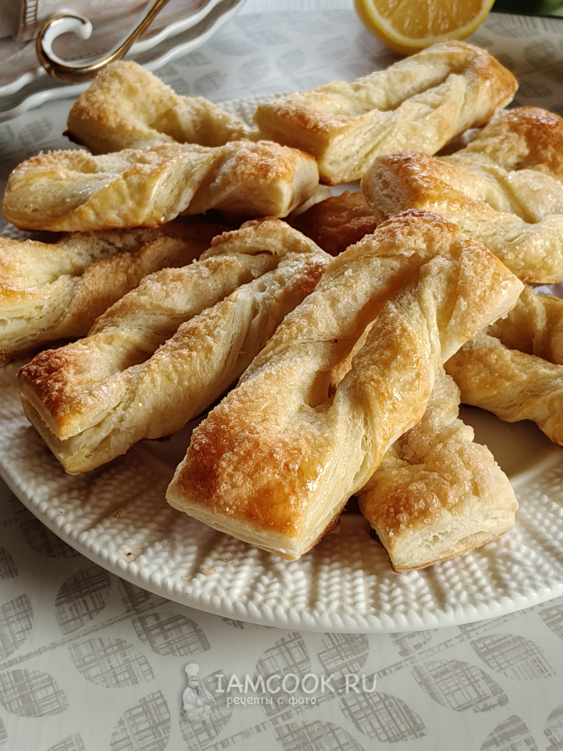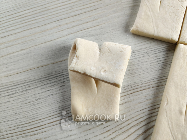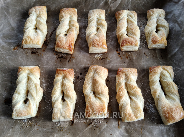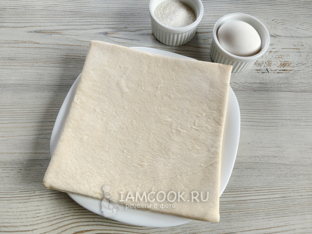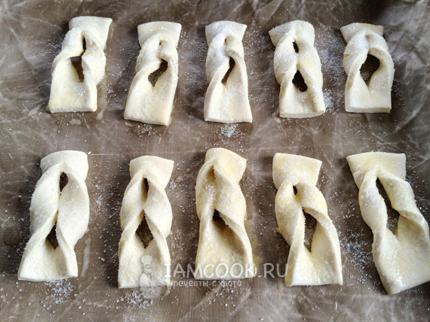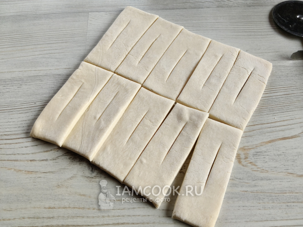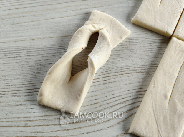Приготовьте три ингредиента для хвороста из слоеного теста в духовке.