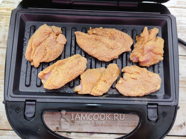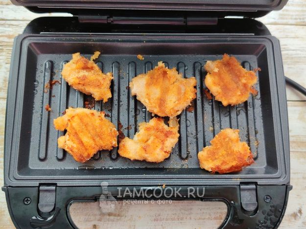 Выложить на прогретую панель для гриля мультипекаря, смазанную маслом. Масло наносить на поверхность тонким слоем силиконовой кисточкой, чтобы панировка не впитала много жира.
