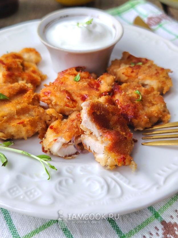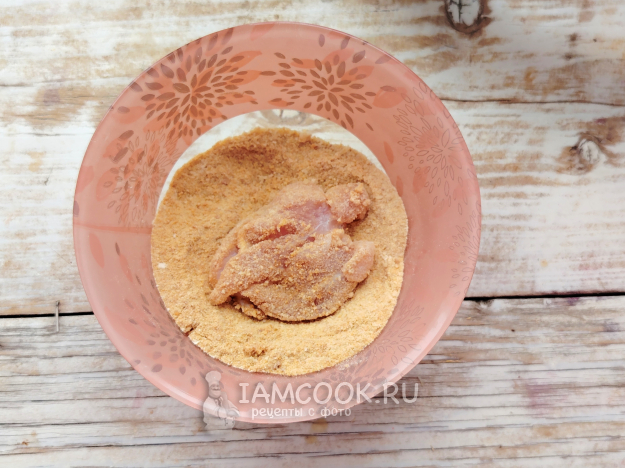 Во вторую пиалку насыпать сухарики. Куриные кубики обмакнуть каждый в яичную смесь и обвалять в сухарях.