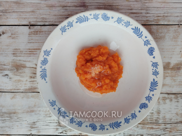 Слегка остывшее морковное пюре поместить в глубокую посуду, добавить соль, влить масло, перемешать.