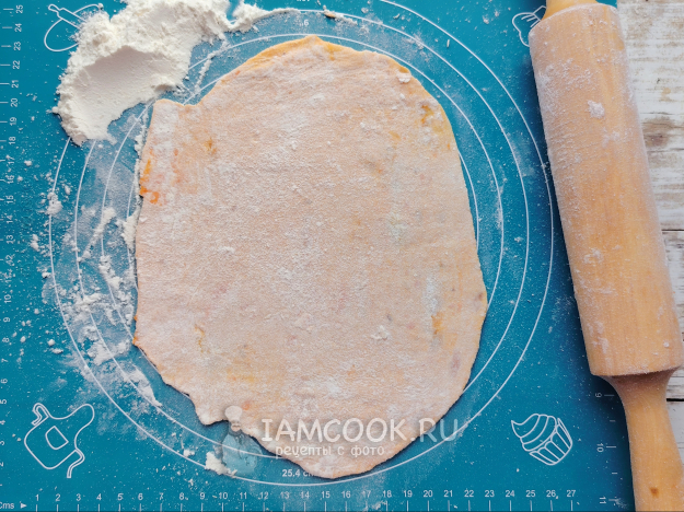 Отдохнувшее тесто раскатать в тонкий пласт на подпыленной мукой рабочей поверхности.
