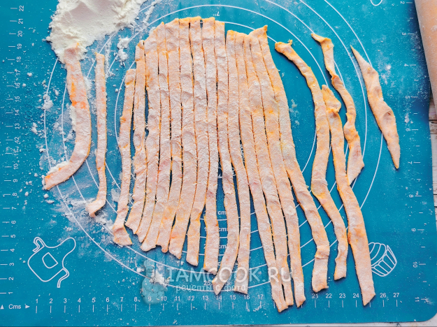 Ножом разрезать тесто на тонкие полосочки. Обвалять их в муке и дать им немного подсохнуть на столе.
