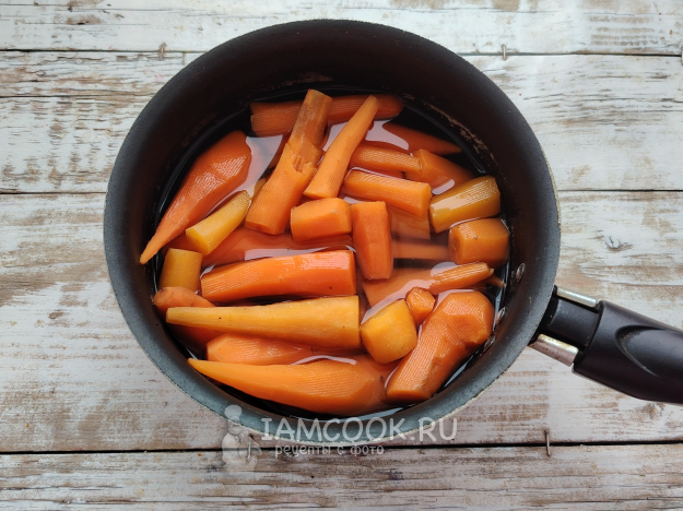 Морковь помыть, почистить, разрезать на кусочки, или оставить, если овощ некрупный, залить водой, поставить на огонь отвариваться в подсоленной воде до готовности.