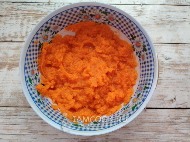Отвар слить, морковь пюрировать блендером или ручным измельчителем до однородной консистенции.