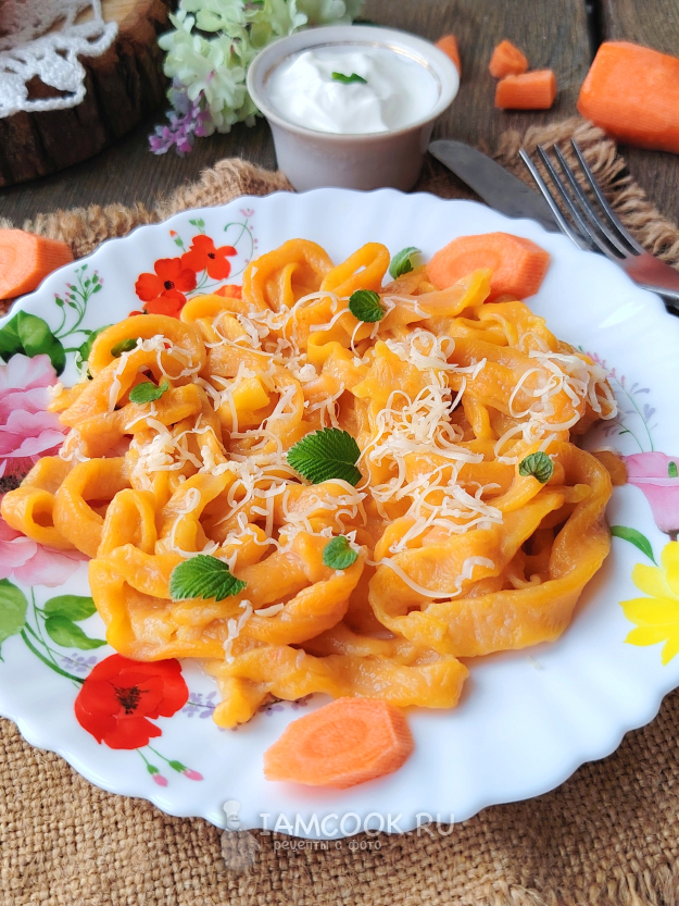 Отварить морковную лапшу в подсоленной воде до готовности, варить достаточно 6-7 минут.