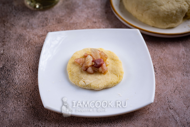 Отделяйте от картофельного теста небольшие части. Из каждой такой части сформируйте сначала блинчик, выложите на центр 2 ч.л. бекона с луком.