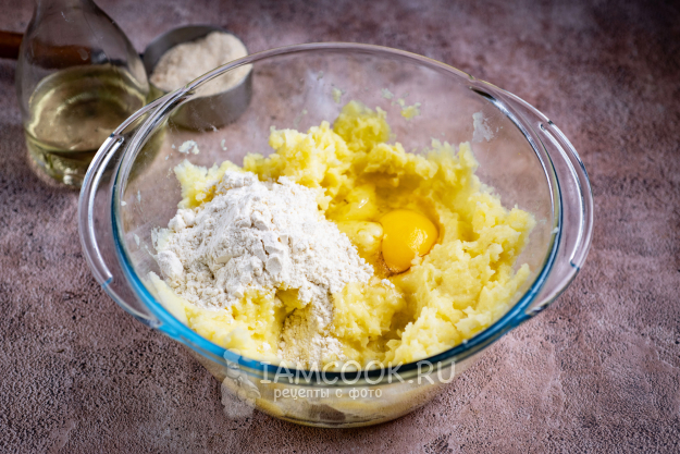 К картофельному пюре вбейте яйцо, добавьте муку.