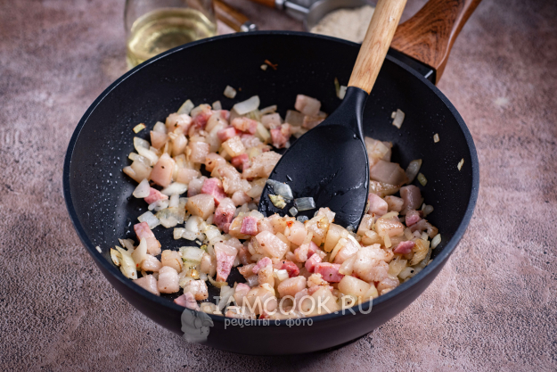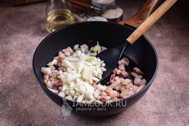 В сковороду выложите и на среднем огне растопите бекон, помешивая лопаткой. Добавьте лук.