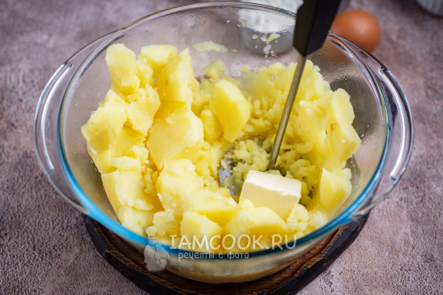 Отварной картофель переложите для удобства в просторную миску, толкушкой истолките в пюре, добавив сливочное масло.