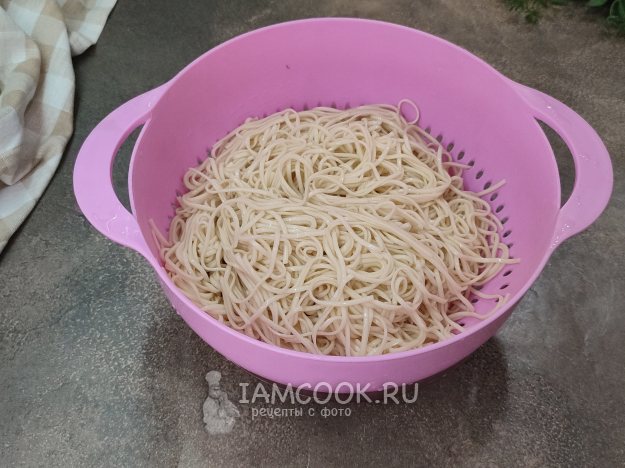 Удон отварите согласно инструкции на упаковке. Варится он, как правило, очень быстро. У меня на упаковке время варки было указано 5-6 минут, но лапша была готова через 3, так что лучше попробовать). Затем промываем лапшу холодной водой, откидываем на сито.