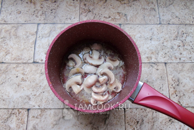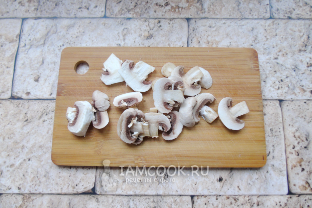 Шампиньоны очистите и нарежьте пластинами.