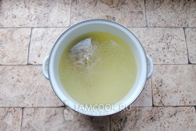 Добавьте в кастрюлю к луку и чесноку. Налейте 500 мл индюшиного бульона и варите грибы 10 минут.