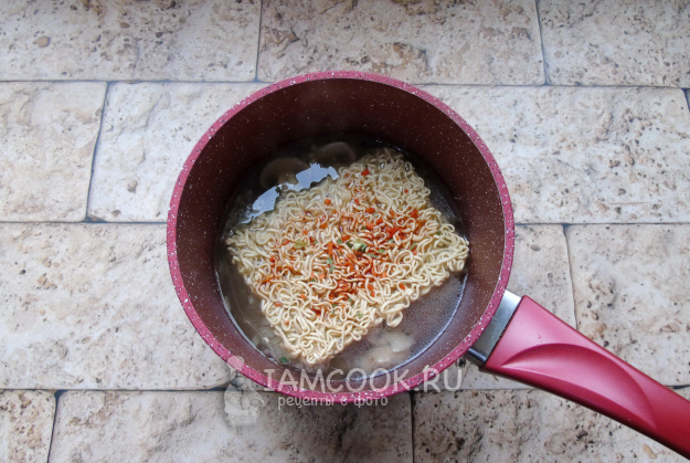 После выложите рамен из пакета, насыпьте специи, которые были в упаковке. Налейте соевый соус. Варите рамен с грибами, луком, чесноком и специями 4-5 минут.