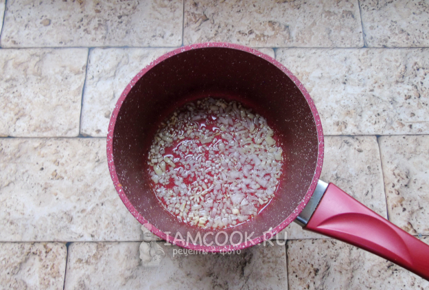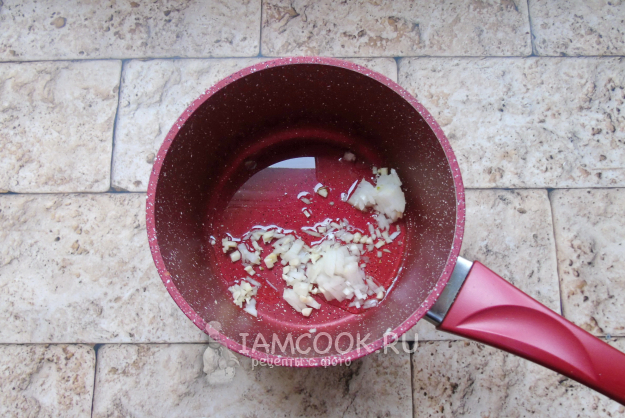 Чеснок и репчатый лук мелко нарежьте. Отправьте в кастрюлю с растительным маслом.