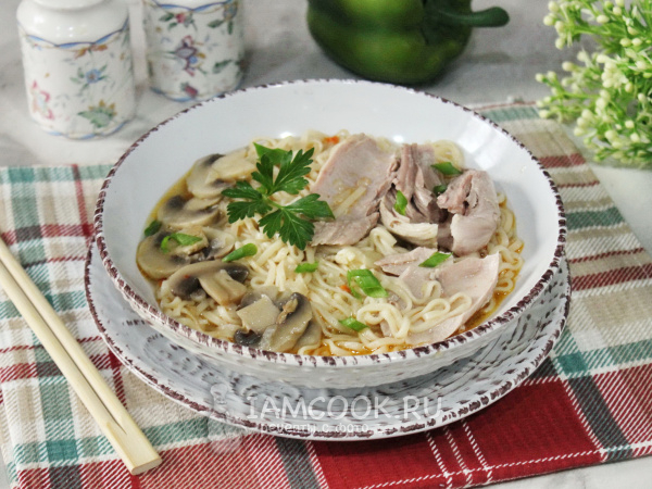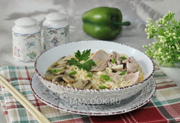 При подаче выложите в тарелку лапшу и шампиньоны. Добавьте отварную индейку, посыпьте нарезанным зеленым луком. Рамен с индейкой готов.